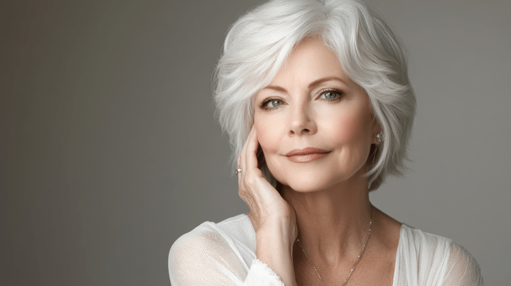 Invece di coprire i capelli grigi, l’effeto silver soft viene esaltato con sfumature eleganti e naturali.